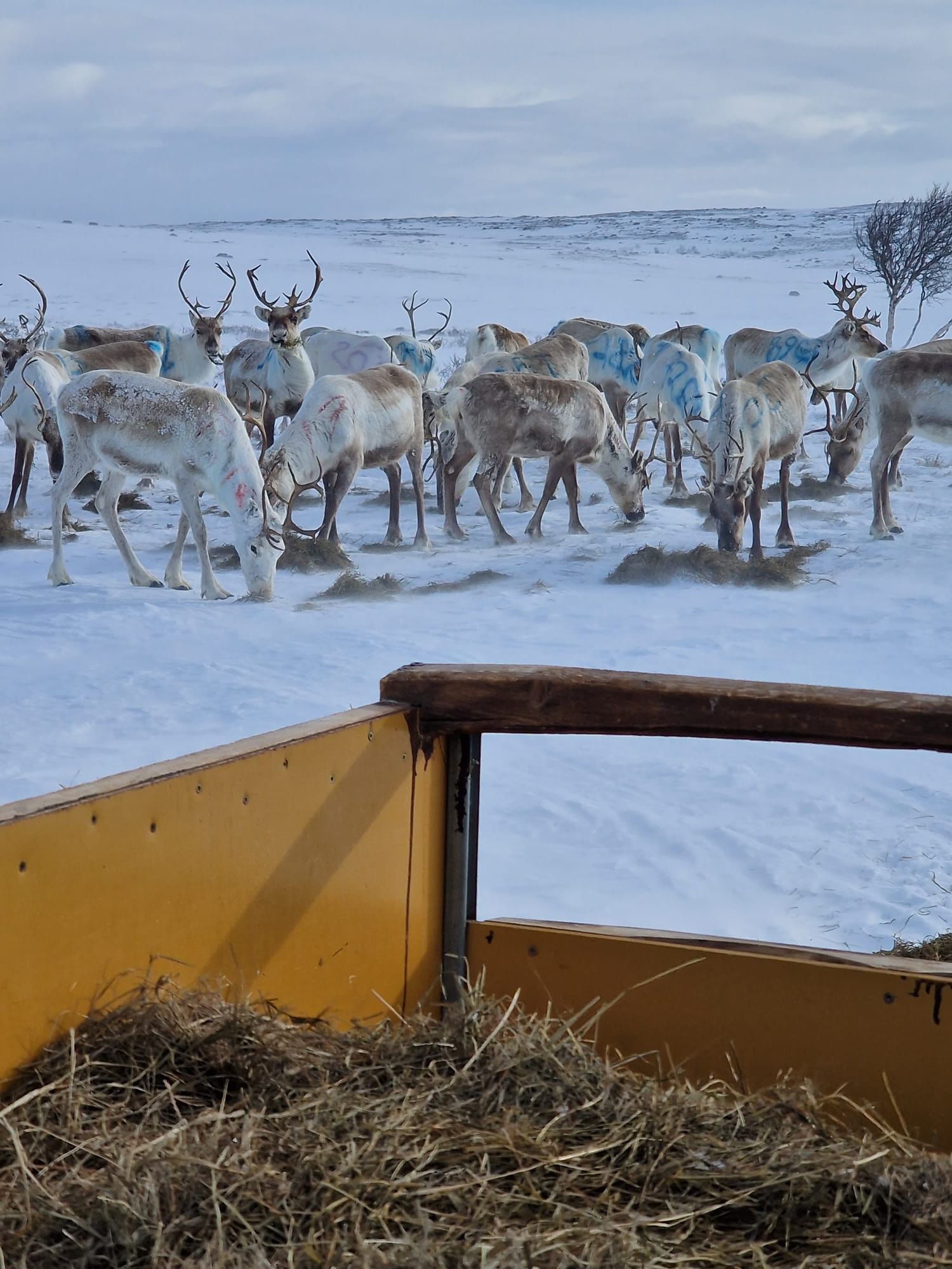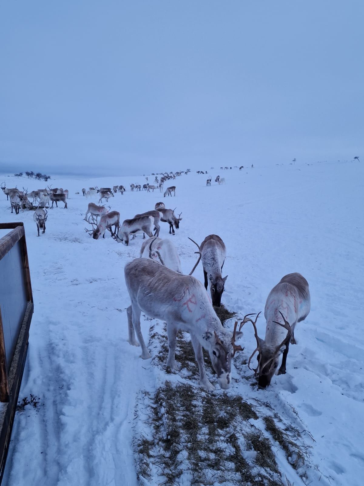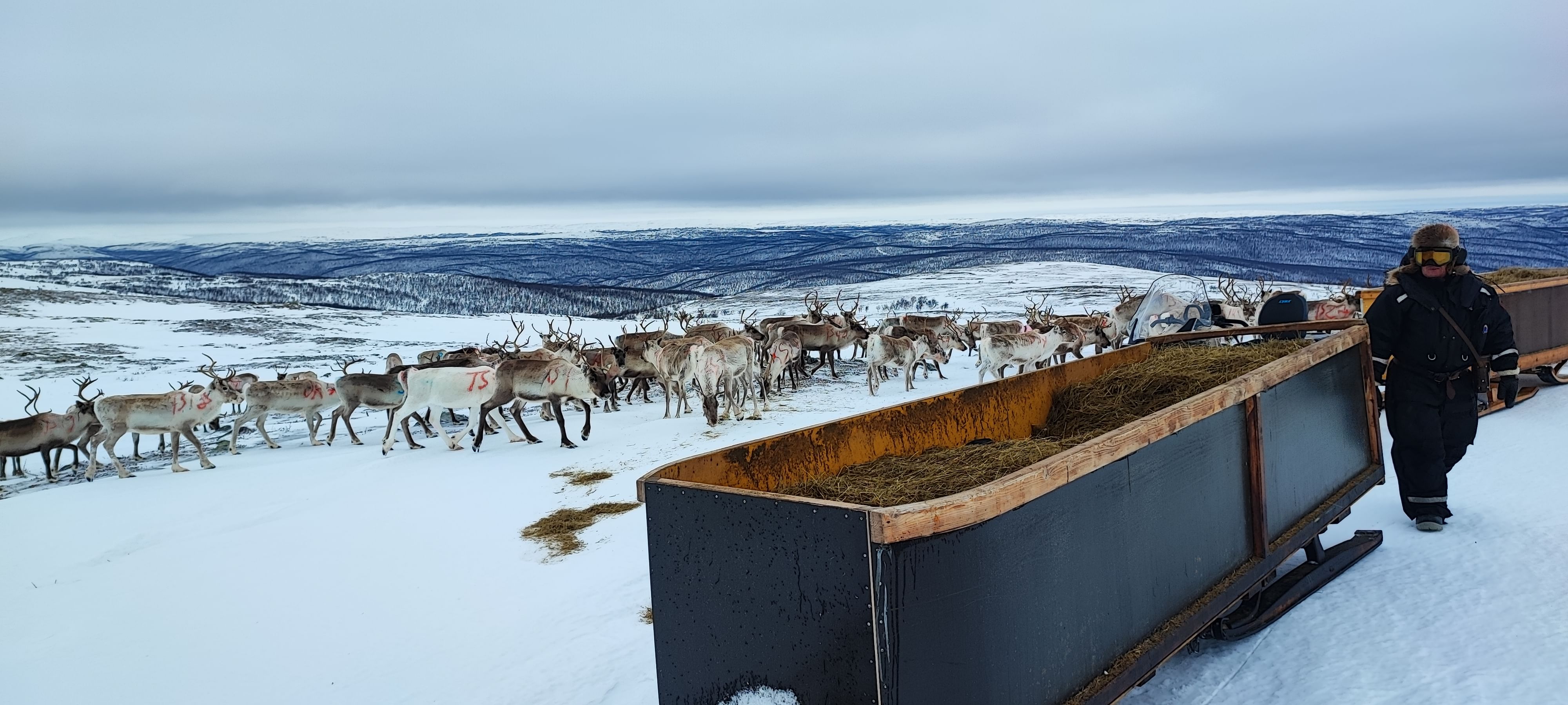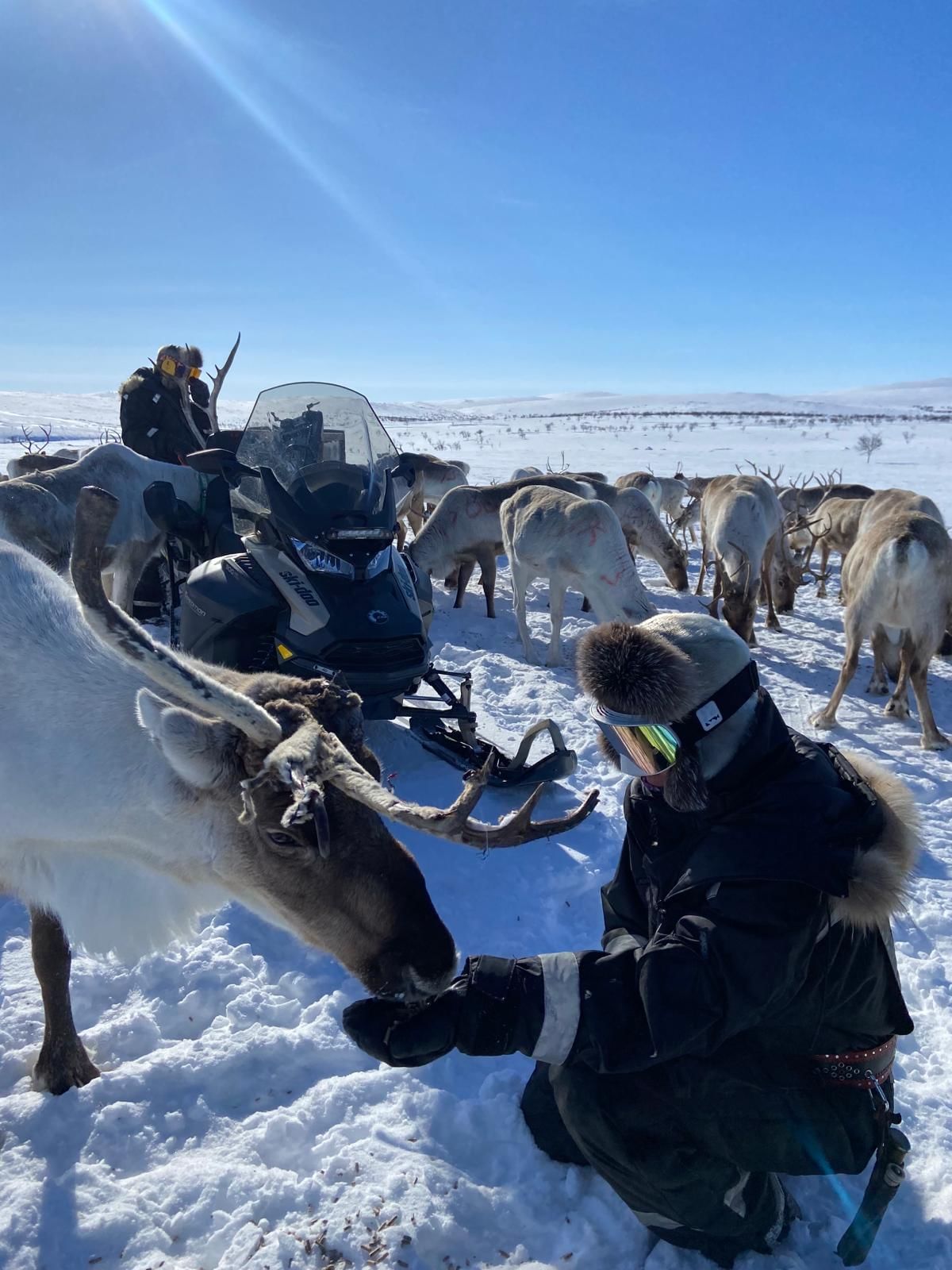 In Utsjoki, there are more reindeer than people. On these lands, the Sámi reindeer herders herd their freely grazing reindeer. Most of our work in wilderness conditions with our wild reindeer is too dangerous to take any guests with us, but during March and April, also guests have the possibility to join our reindeer herding work on the fells, in a safe way. That is the time of the year when we provide our reindeer extra food to help them survive through the long winter. We drive to the fells with snowmobiles, with guests traveling in sleds. On this program, you are participating in a real working day of Sámi reindeer herding. If you wish, you can also help feeding our reindeer from the big hay sleds. During the tour, you get to see the magnificent fell view and wildlife of Paistunturi wilderness area, listen to stories about life in the Arctic and reindeer herding, enjoy some hot drinks and see wild reindeer in their natural habitat in the wilderness. The tour is usually about 3 hours, depending on the location of our herd. We can pick you up within 10 km from Utsjoki village and provide extra winter gear and helmets for the tour.