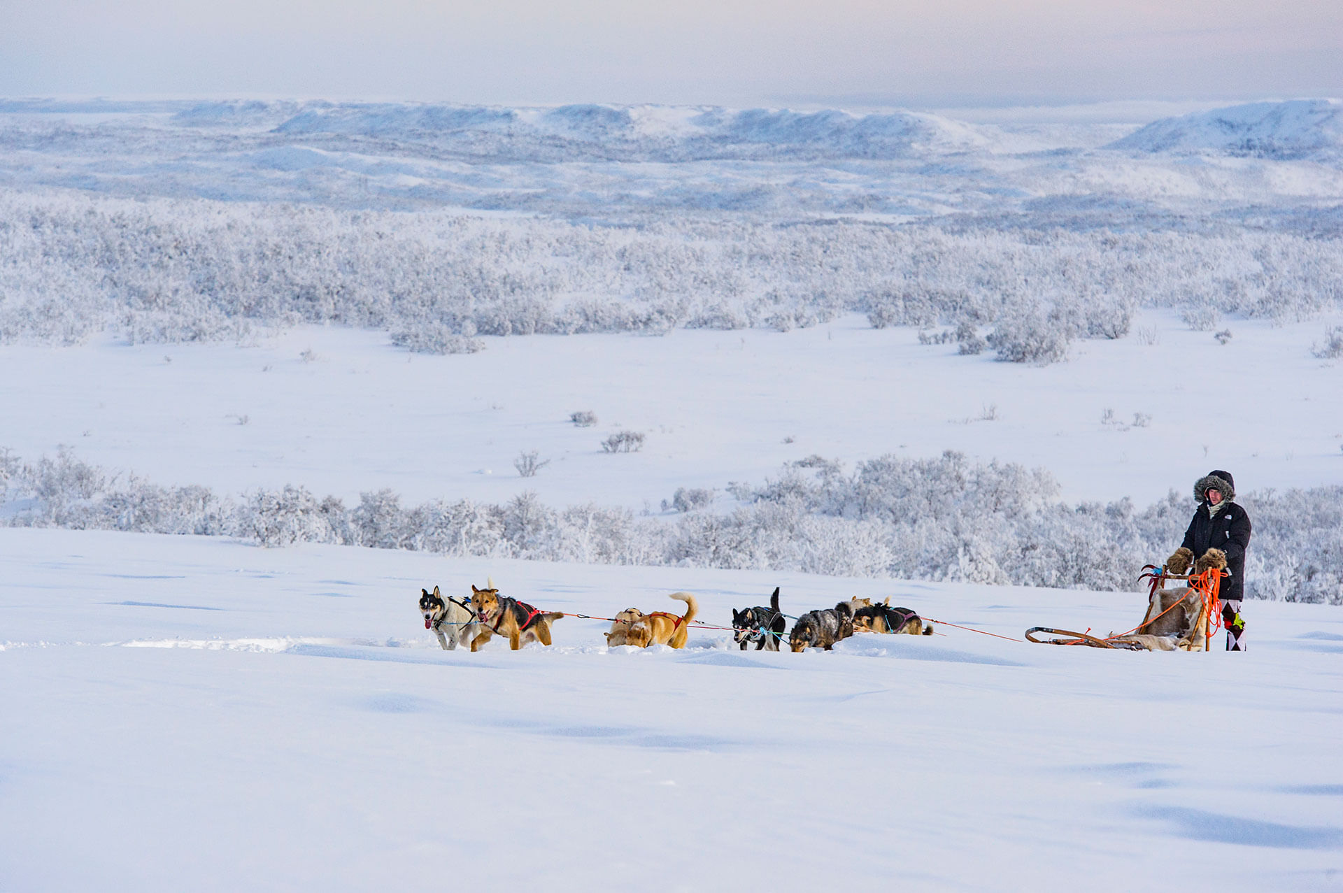 Husky sledding is originally from Siberian and Inuit regions, but has spread as a sport and tourism attraction to other regions with cold climate as well. If you want a husky experience in the gorgeous arctic scenery without mass tourism, then this experience is for you. We will pick you up from your accommodation in Utsjoki, provide some extra winter gear if needed, and take you to a small, private husky farm on the Norwegian side of the River Teno (transfer is about 1 hour). An experienced local musher will meet you at the farm and tell you about the huskies, their training and how to drive a husky sled. You can try driving the husky sled on the fields close to the farm. We will take you back to your accommodation in Utsjoki after the sledding.